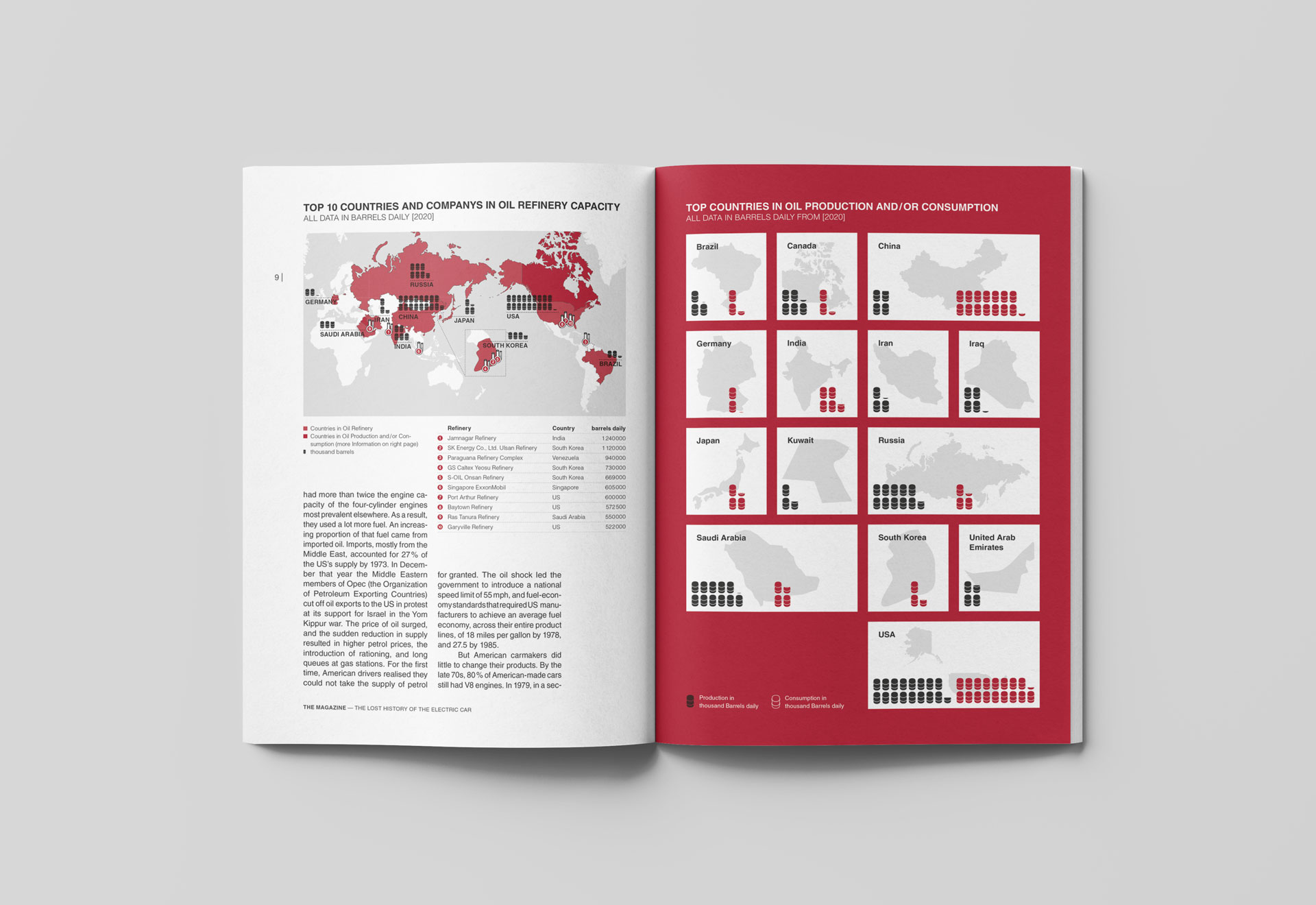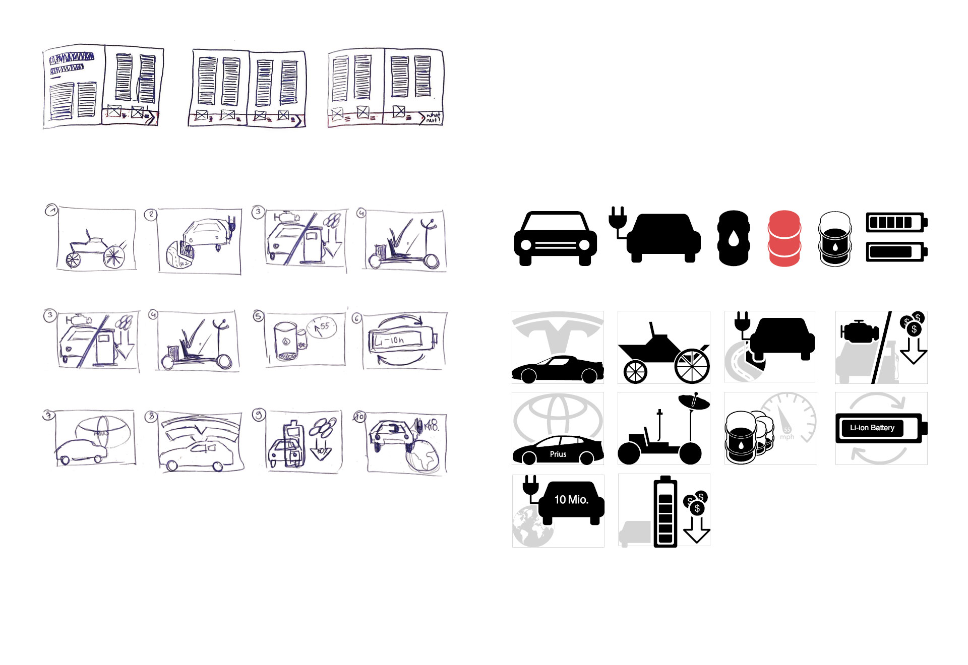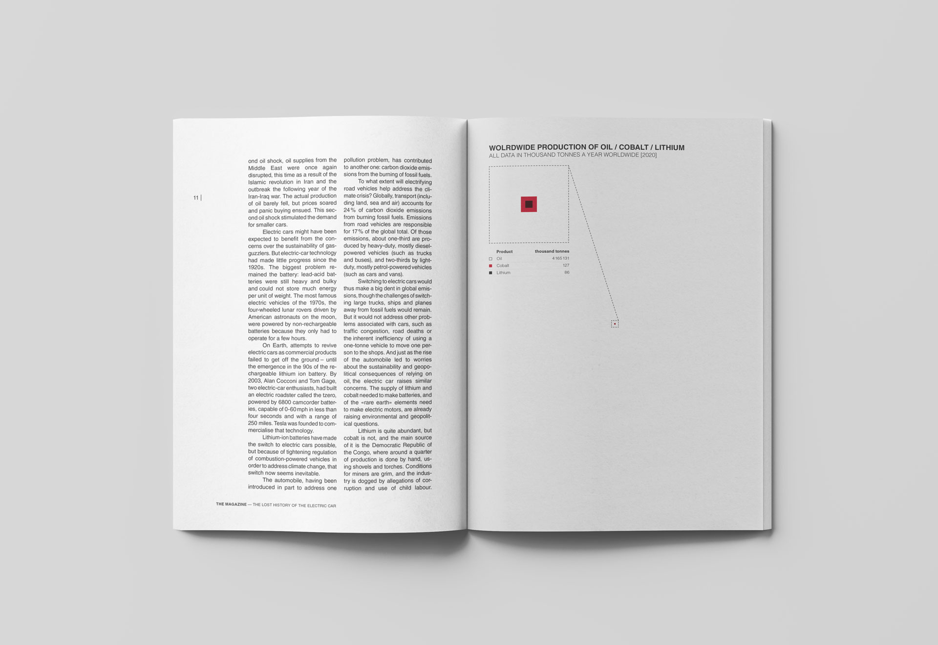 For a given newspaper article, I had to consider what kind of information and data would be helpful or add context and dimension to the article. The goal of the given task was to create comprehensive and coherent information Graphics. All while challenging myself to come up with novel ways to visualize and present the data in a way that is both engaging and clear. All while considering the following: scale, focal point, perspective, complexity, colour, form and relation of the objects and what story am I telling. The biggest challenge was the research for usable data. A lot of basic data can be easily found online, however thorough information that cover all the needs require a lot of research. Another challenge came up later when trying to display the worldwide production of oil, cobalt and lithium which showed significant differences in quantity. After reading the article I did a quick search online to get a feeling of what information I can gather online. Then coming up with ideas of what data could be of interest and ways how to visualize them was rather easy. As always some first sketches where made which helped a great deal when researching for data. first sketches It was then time to conduct some study. Since the data is the foundation of the information graphics it was from the utmost importance to do in-depth research to find useful information. According to my findings I altered the sketches so they would fit the specific data. While it was simple to come up with some visualizations, the right display of information of others was tricky. Especially since the Illustrations should not just be simple diagrams. The sketches helped build the foundation of the illustrations, but then it was a lot of playing around with the different dimensions in Illustrator and InDesign trying to display the data as comprehensive and detailed as possible. Creation process of the information graphics The following Mockups show my final Work Data visualization is the result of a thorough and deliberative thought process. Creating information visuals that should challenge the viewers’ perception of the content entails a significant degree of responsibility.// brief