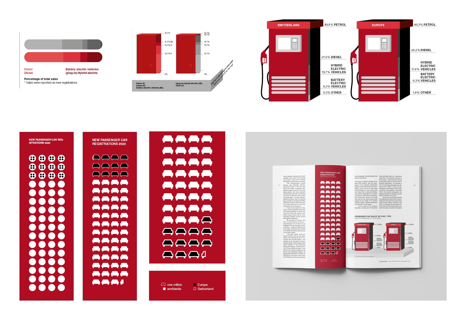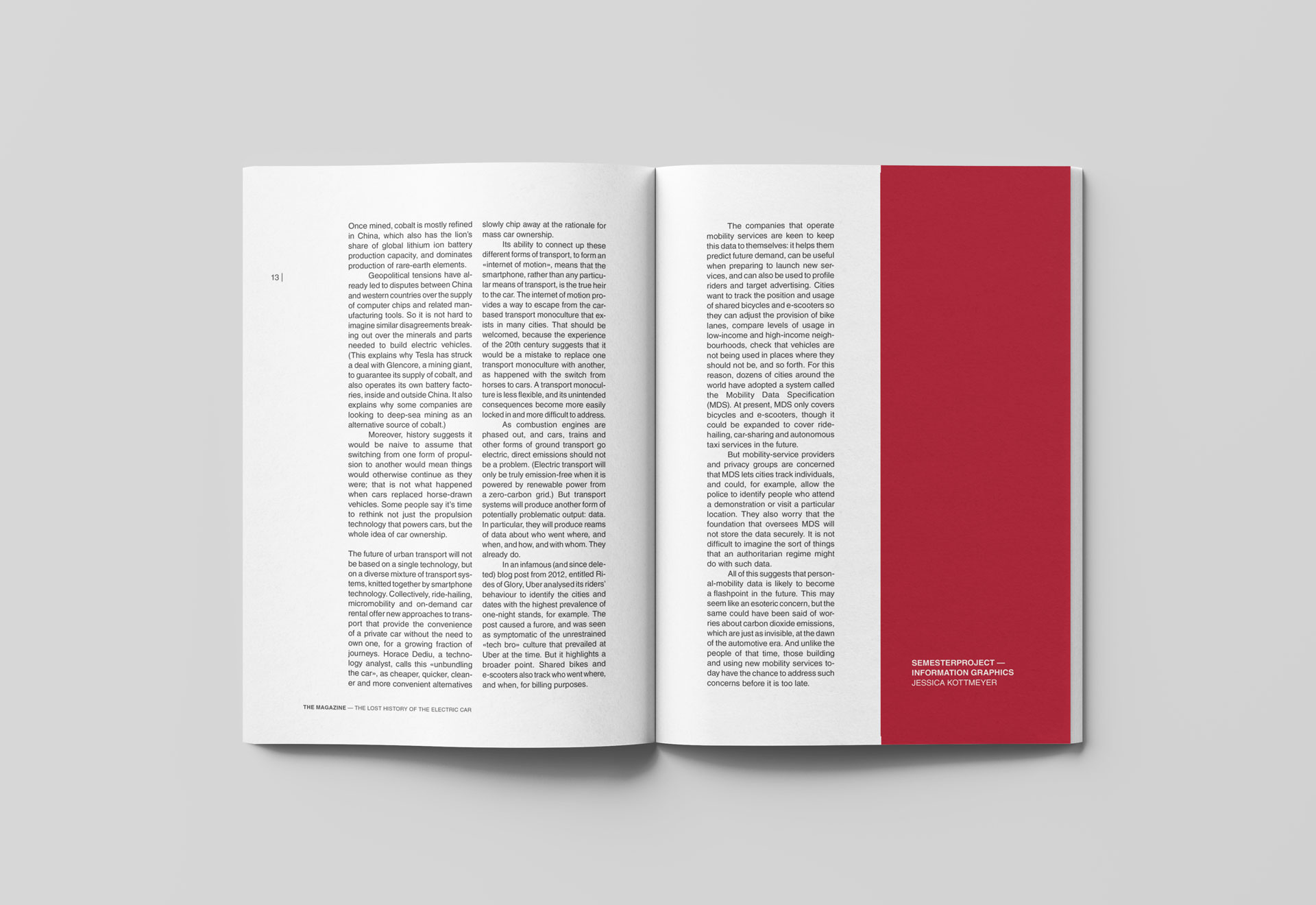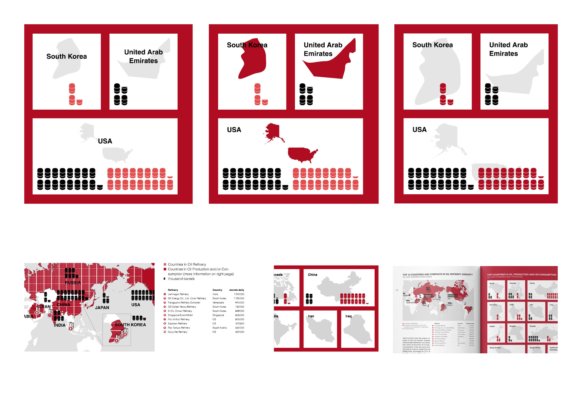 For a given newspaper article, I had to consider what kind of information and data would be helpful or add context and dimension to the article. The goal of the given task was to create comprehensive and coherent information Graphics. All while challenging myself to come up with novel ways to visualize and present the data in a way that is both engaging and clear. All while considering the following: scale, focal point, perspective, complexity, colour, form and relation of the objects and what story am I telling. The biggest challenge was the research for usable data. A lot of basic data can be easily found online, however thorough information that cover all the needs require a lot of research. Another challenge came up later when trying to display the worldwide production of oil, cobalt and lithium which showed significant differences in quantity. After reading the article I did a quick search online to get a feeling of what information I can gather online. Then coming up with ideas of what data could be of interest and ways how to visualize them was rather easy. As always some first sketches where made which helped a great deal when researching for data. first sketches It was then time to conduct some study. Since the data is the foundation of the information graphics it was from the utmost importance to do in-depth research to find useful information. According to my findings I altered the sketches so they would fit the specific data. While it was simple to come up with some visualizations, the right display of information of others was tricky. Especially since the Illustrations should not just be simple diagrams. The sketches helped build the foundation of the illustrations, but then it was a lot of playing around with the different dimensions in Illustrator and InDesign trying to display the data as comprehensive and detailed as possible. Creation process of the information graphics The following Mockups show my final Work Data visualization is the result of a thorough and deliberative thought process. Creating information visuals that should challenge the viewers’ perception of the content entails a significant degree of responsibility.// brief